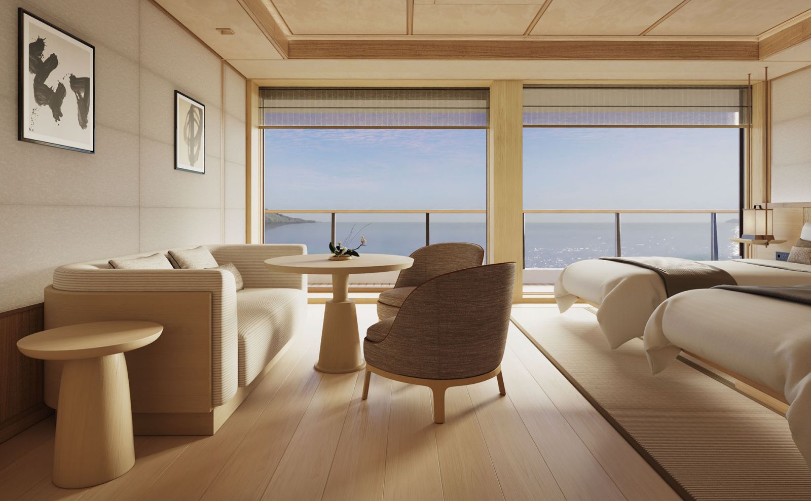 的設計旨在打造海上和諧的休憩之所,寬敞的落地窗將一望無際的海景盡收眼底。每間套房均配有私人柚木露台、臨窗躺椅和優雅的浸泡式浴缸,讓您盡情享受靜謐休息或共享奢華體驗。貼心的細節和溫馨的裝飾營造出既令人身心舒暢又精緻優雅的氛圍。賓客亦可選擇擴展居住空間,將鄰近套房無縫連接,打造兩房或三臥套房。尊享套房兼具隱私和安縵標誌性的低調奢華風格,完美詮釋了以海平線為靈感的舒適體驗