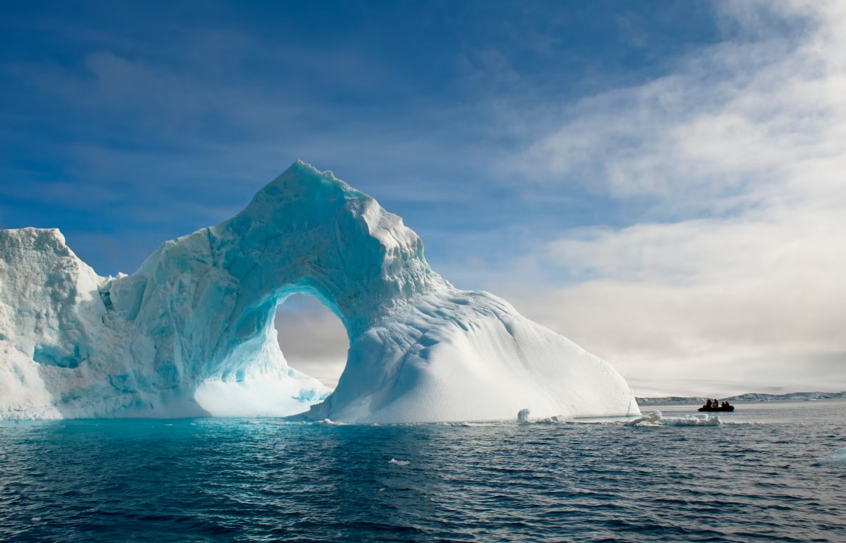 Zodiac 橡皮艇緩緩駛向冰山之間,遠方企鵝成群站在冰原上,冰川在陽光下發出藍色的光