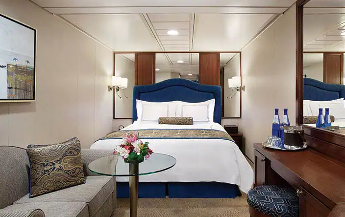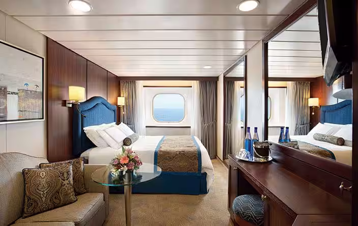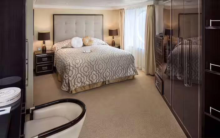 ● 特殊福利:完全重新設計的壁櫥、梳妝台和梳妝台,這些 165 平方英尺的特等艙感覺更加寬敞。寬敞的休息區、梳妝台、冷藏迷你吧和早餐桌與時尚新裝飾的舒緩色調和時尚面料完美相得益彰。